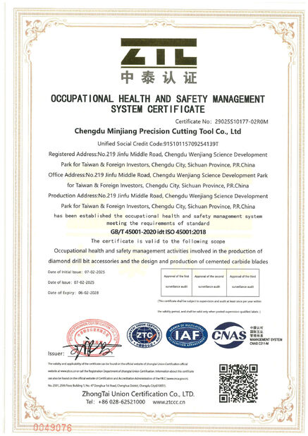Standart:ISO45001:2018 Sayı:29025S10177-02R0M Yayımlanma tarihi:2025-02-07 Bitiş tarihi:2028-02-06 Tarafından verilen:ZHONGTAI UNION CERTIFICATION |